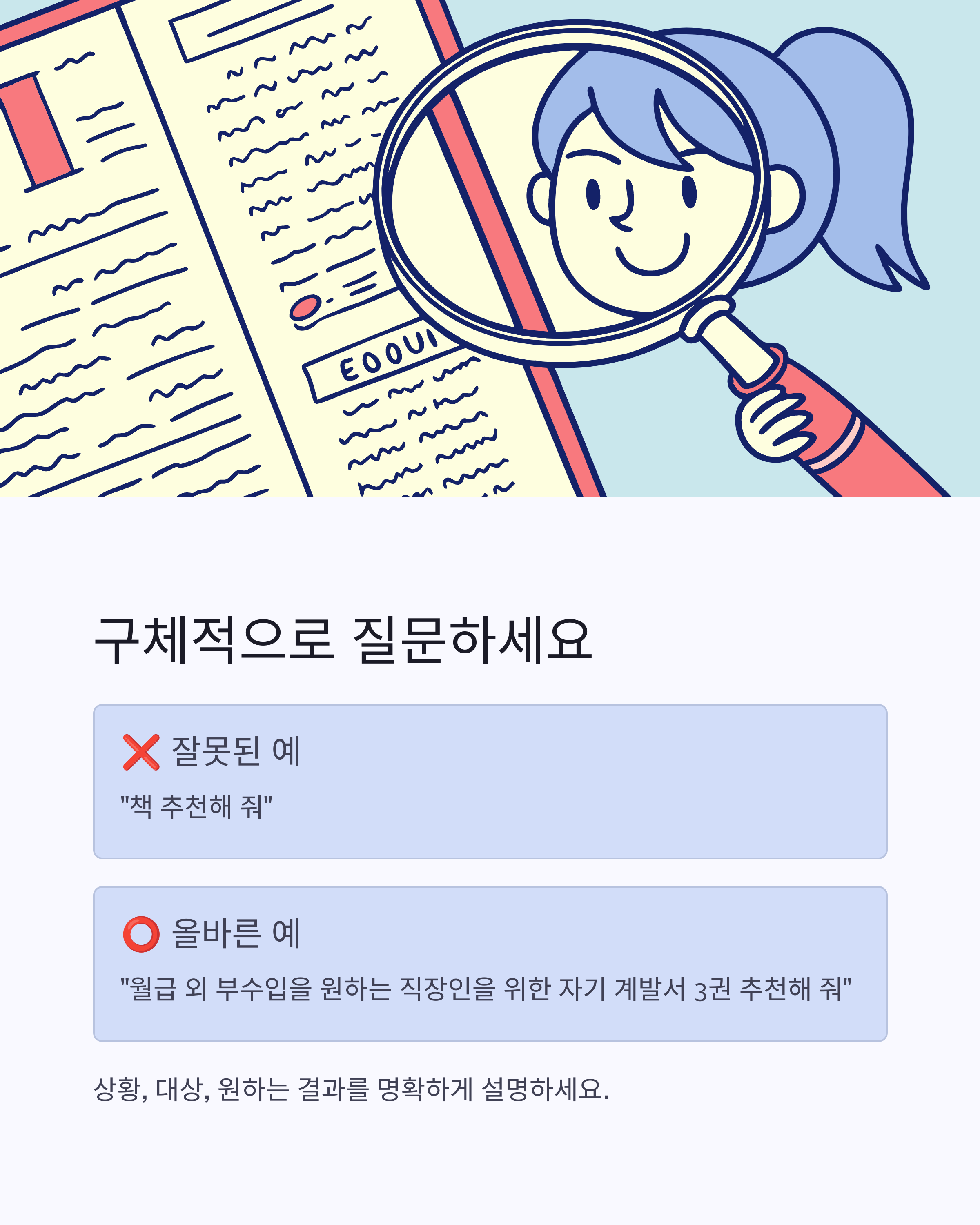 - "책 추천해 줘" ❌ → "월급 외 부수입을 원하는 직장인을 위한 자기 계발서 3권 추천해 줘" ⭕
