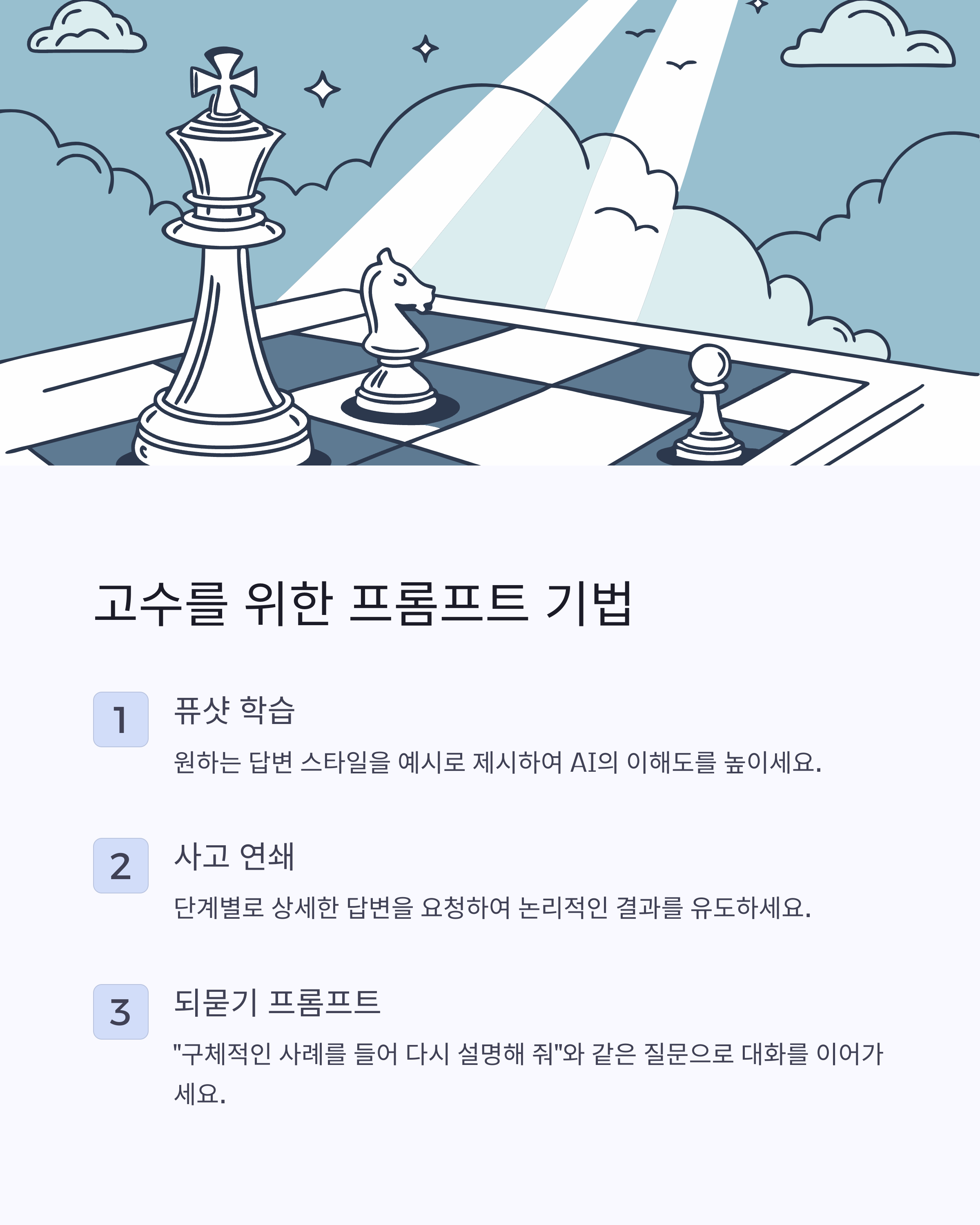 AI가 항상 완벽한 답변을 내놓는 것은 아닙니다. 하지만 실망하기는 아직 이릅니다. 다음과 같은 '되묻기 프롬프트'를 활용하여 AI와 지속적인 대화를 통해 원하는 결과를 얻어낼 수 있습니다.