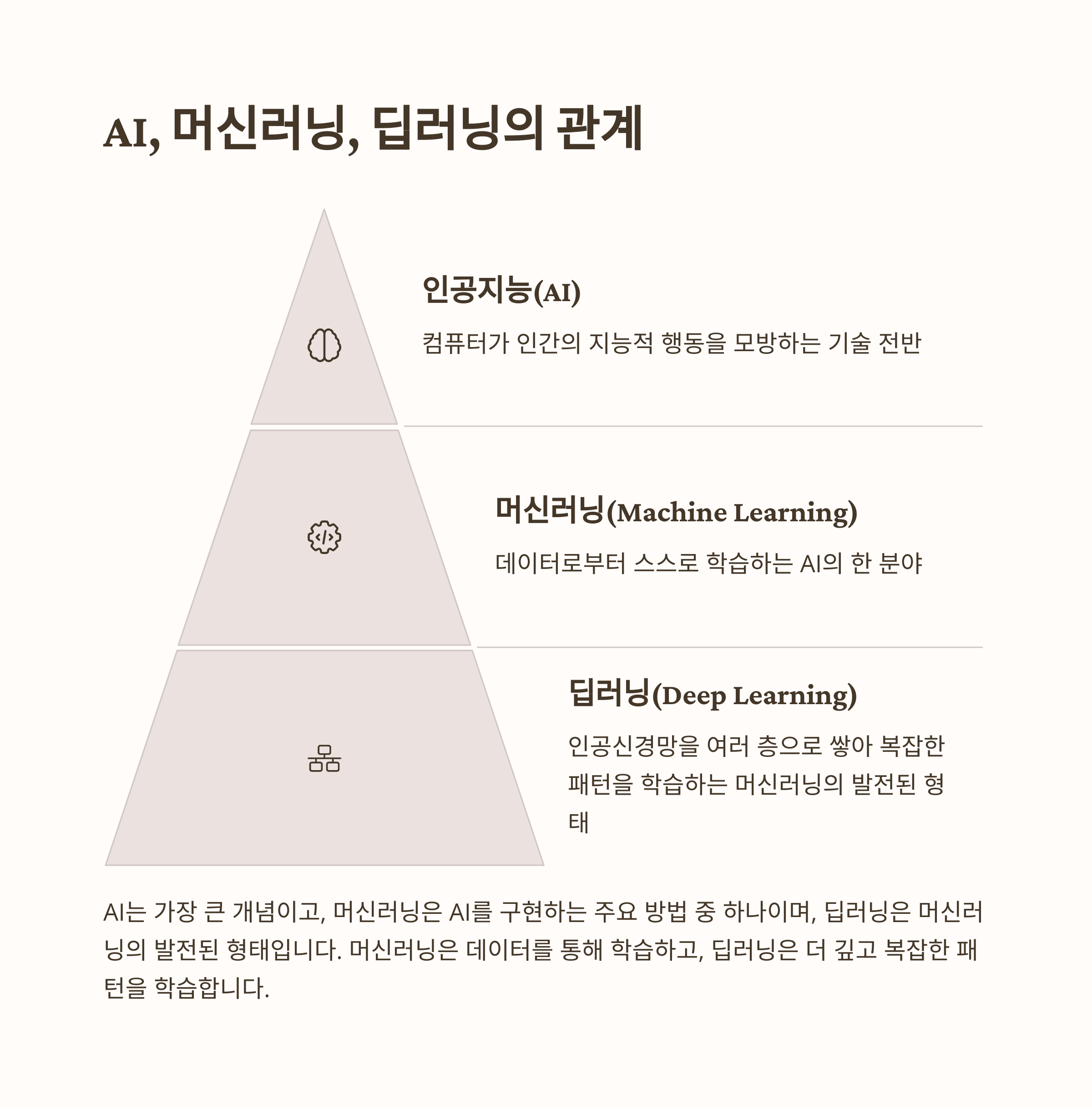 요약하자면, AI는 큰 그림이고, 머신러닝은 AI를 구현하는 주요 방법 중 하나이며, 딥러닝은 머신러닝의 발전된 형태라고 할 수 있습니다.