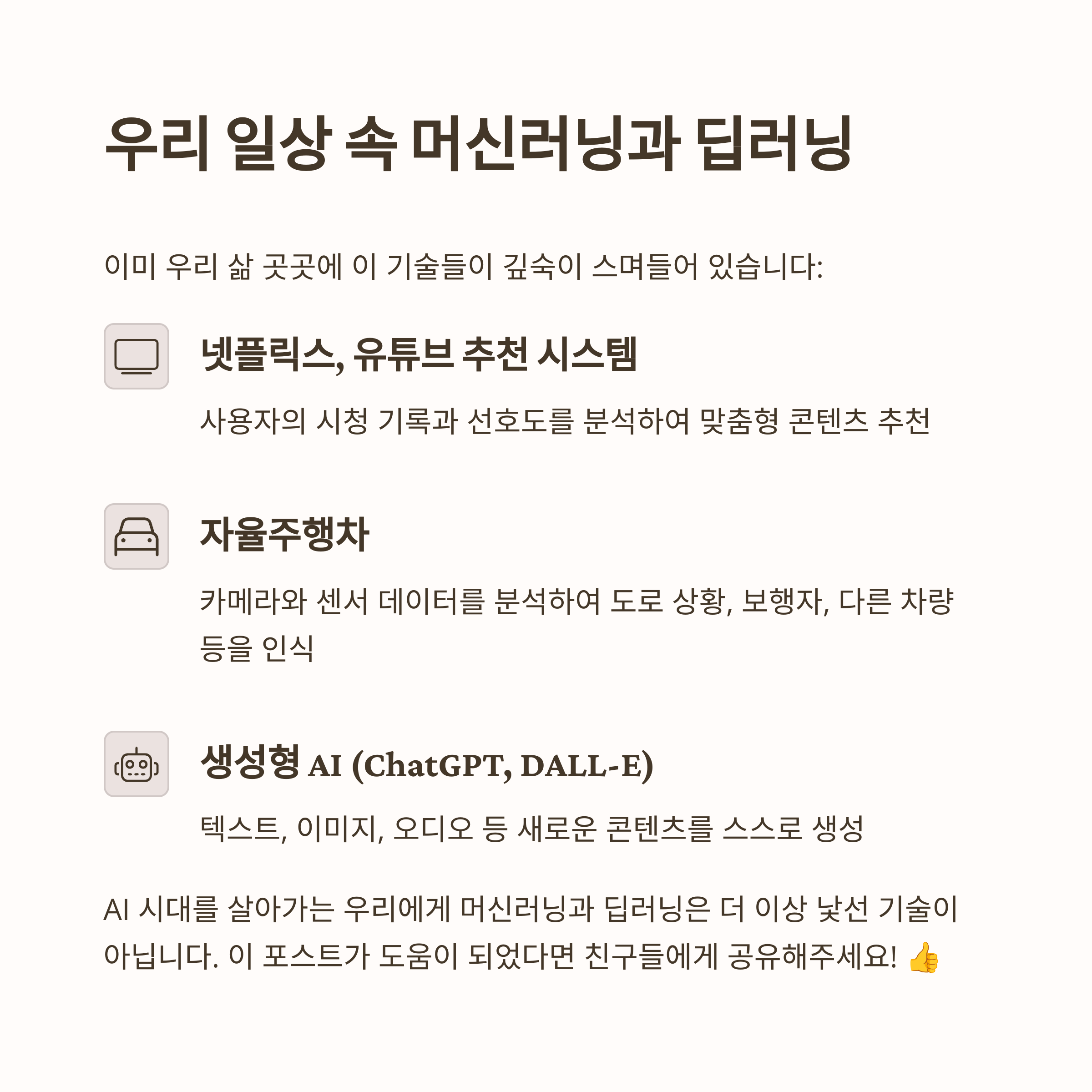이 글에서는 AI의 핵심 기반 기술인 머신러닝과 딥러닝의 기본 개념부터 차이점, 그리고 실생활 적용 사례까지, 초보자도 쉽게 이해할 수 있도록 명쾌하게 설명해 드립니다.