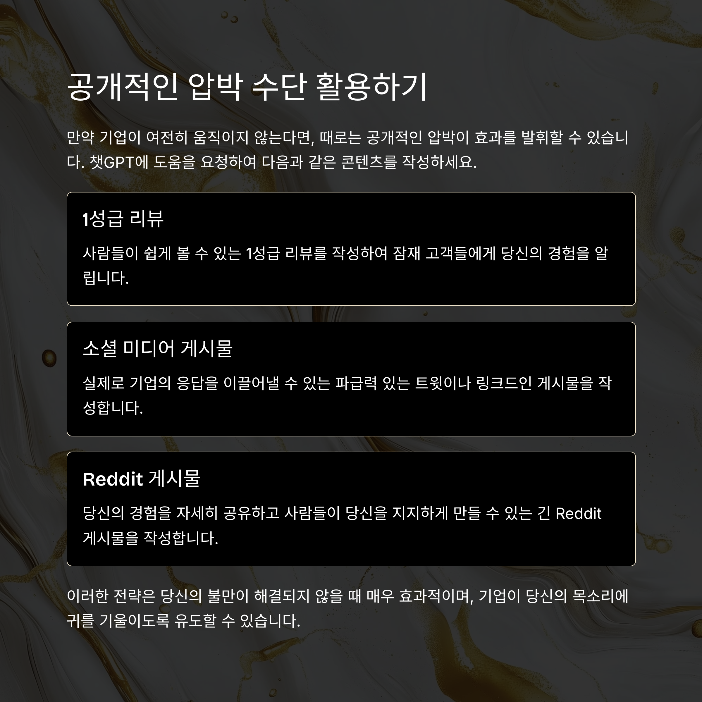 • 공개적인 압박 수단 활용: 만약 기업이 여전히 움직이지 않는다면, 때로는 공개적인 압박이 효과를 발휘할 수 있습니다. 챗GPT에 도움을 요청하여 다음과 같은 콘텐츠를 작성할 수 있습니다.
