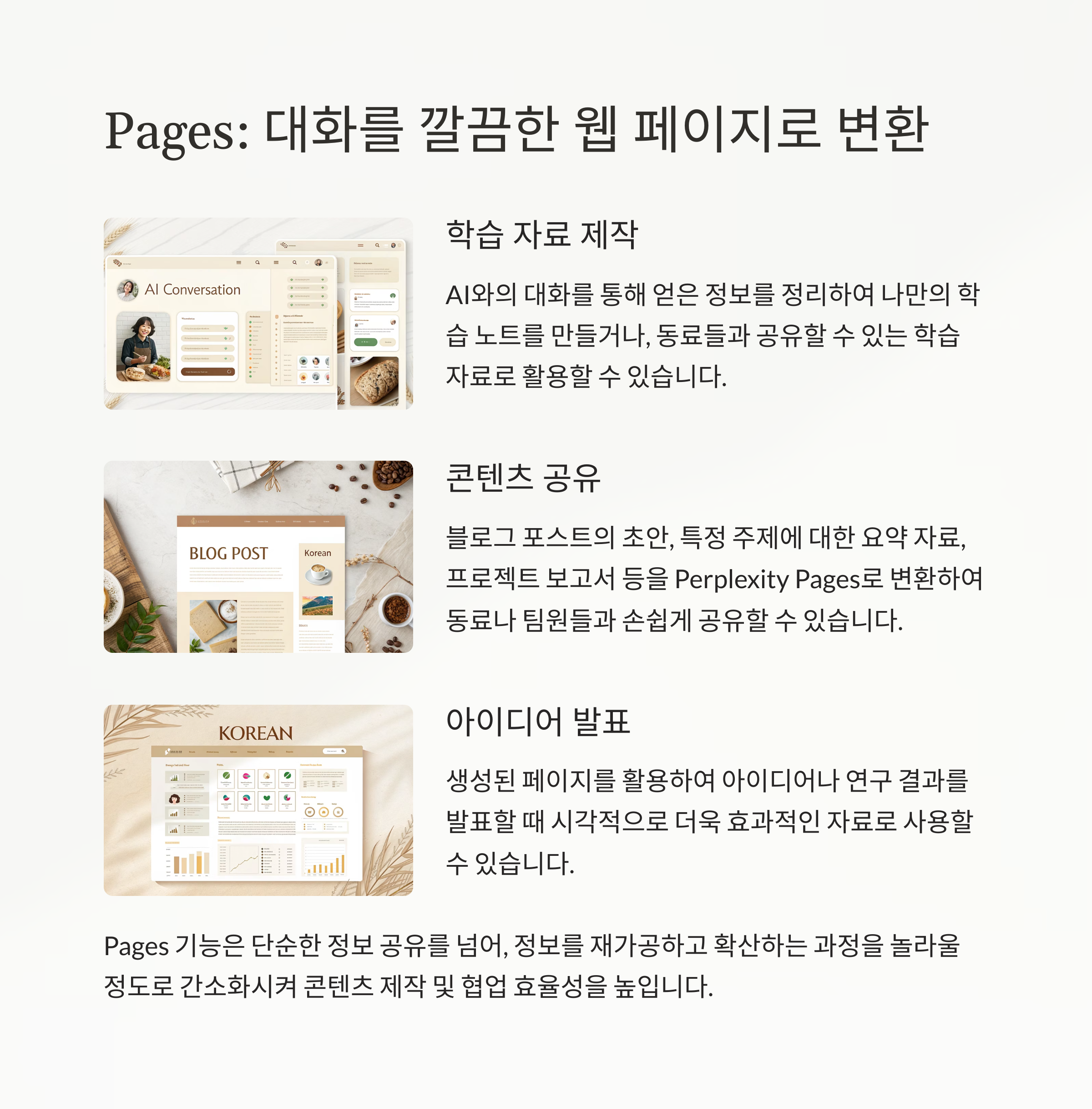 Perplexity AI와의 유익한 대화나 심층 연구 결과를 다른 사람들과 공유하거나, 학습 자료로 보존하고 싶을 때 유용하게 활용할 수 있는 기능이 바로 Pages입니다. 이 기능은 Perplexity AI로 생성된 대화나 심층 연구 결과물을 즉시 깔끔한 웹 페이지로 변환해줍니다.