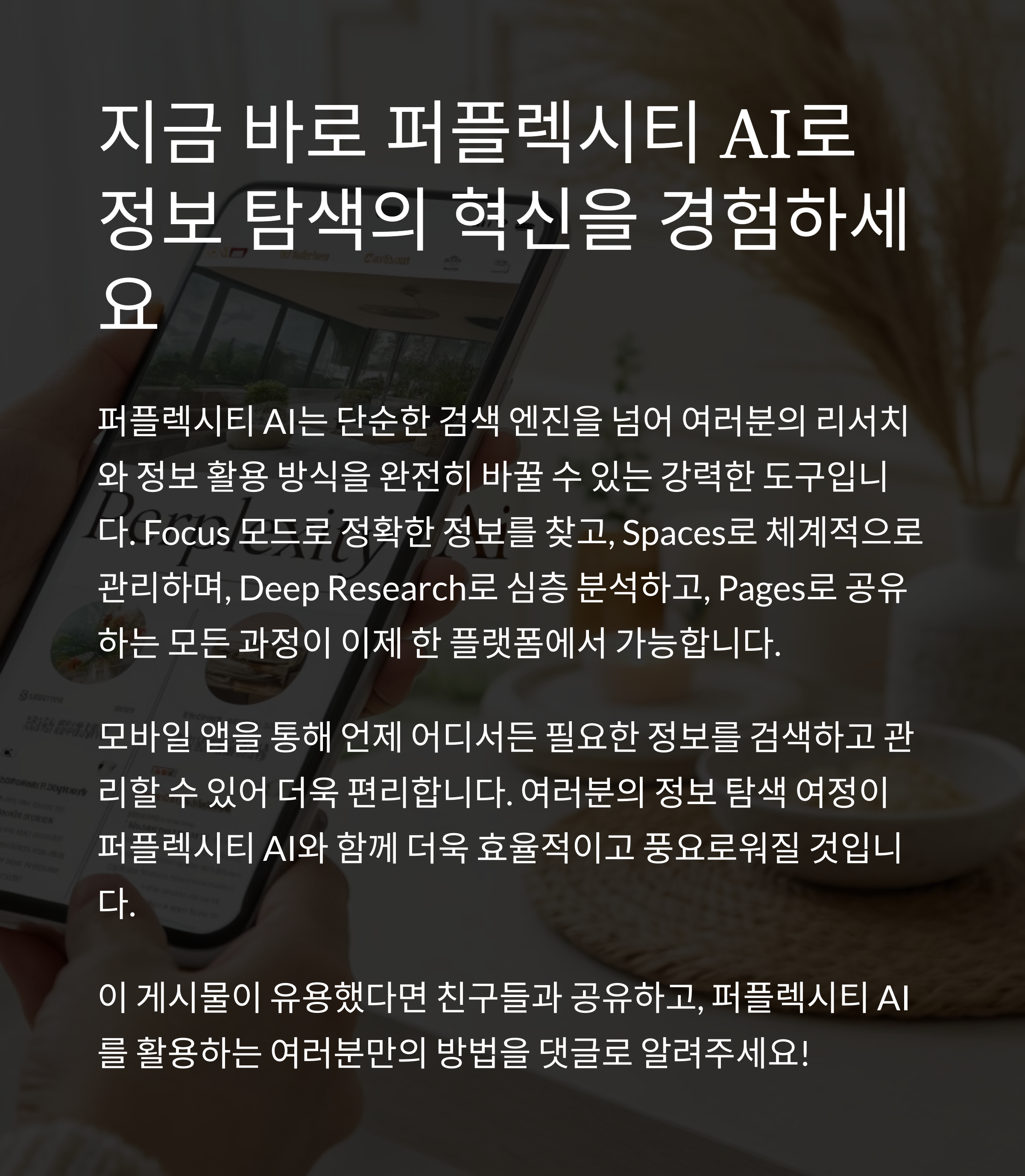 이러한 기능들을 적극적으로 활용한다면, 여러분은 정보의 바다에서 길을 잃지 않고 정확하고 신뢰할 수 있는 정보를 빠르고 효율적으로 얻을 수 있을 것입니다. Perplexity AI는 학술 연구자부터 콘텐츠 크리에이터, 일반 사용자까지 모든 이의 정보 생산성과 효율성을 극대화할 잠재력을 가지고 있습니다. 지금 바로 Perplexity AI를 시작하여 여러분의 리서치 경험을 한 단계 업그레이드해보세요!